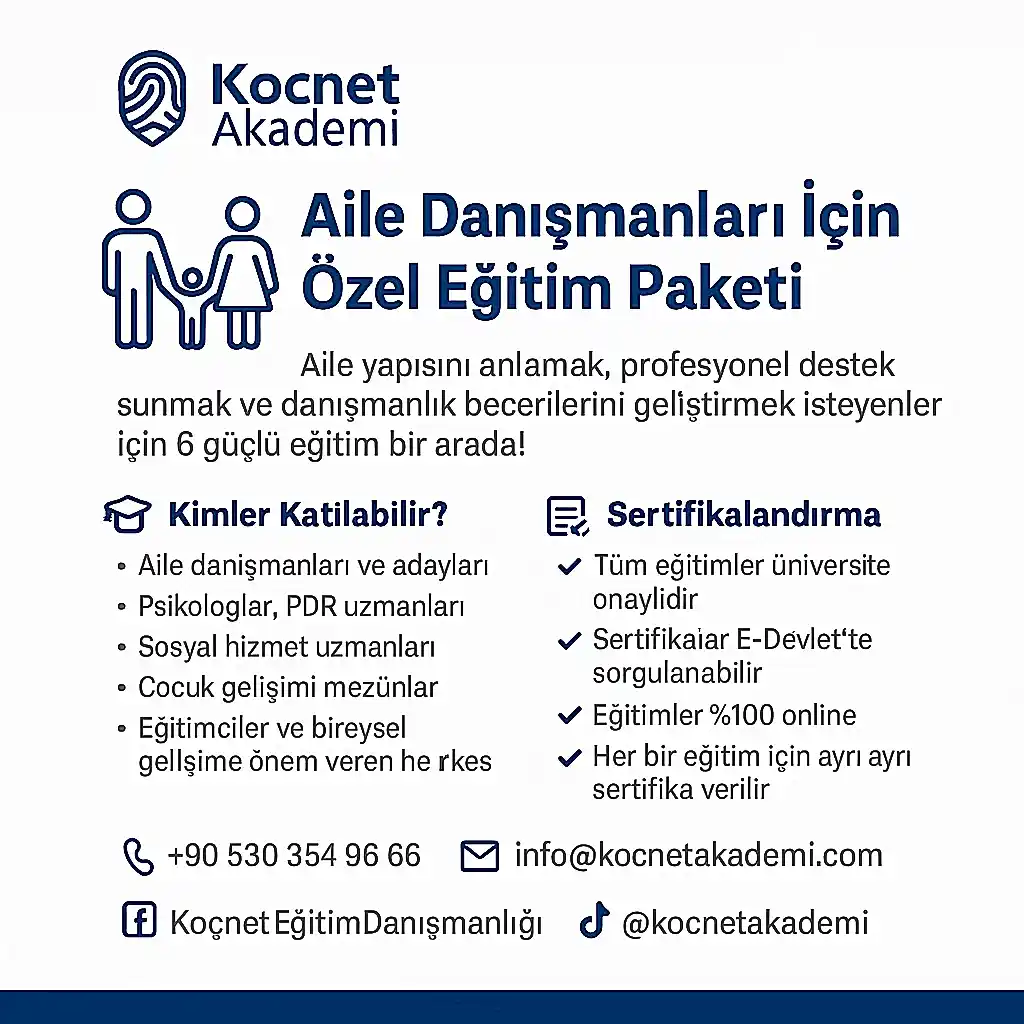 Koçnet Akademi tarafından özel olarak hazırlanan bu kapsamlı eğitim paketi, aile danışmanlığı sürecinde ihtiyaç duyulan temel bilgi, uygulama becerileri ve psikolojik test içeriklerini kapsar. Tüm eğitimler %100 online olup, üniversite onaylı ve E-Devlet’te sorgulanabilir sertifikalarla tamamlanmaktadır.